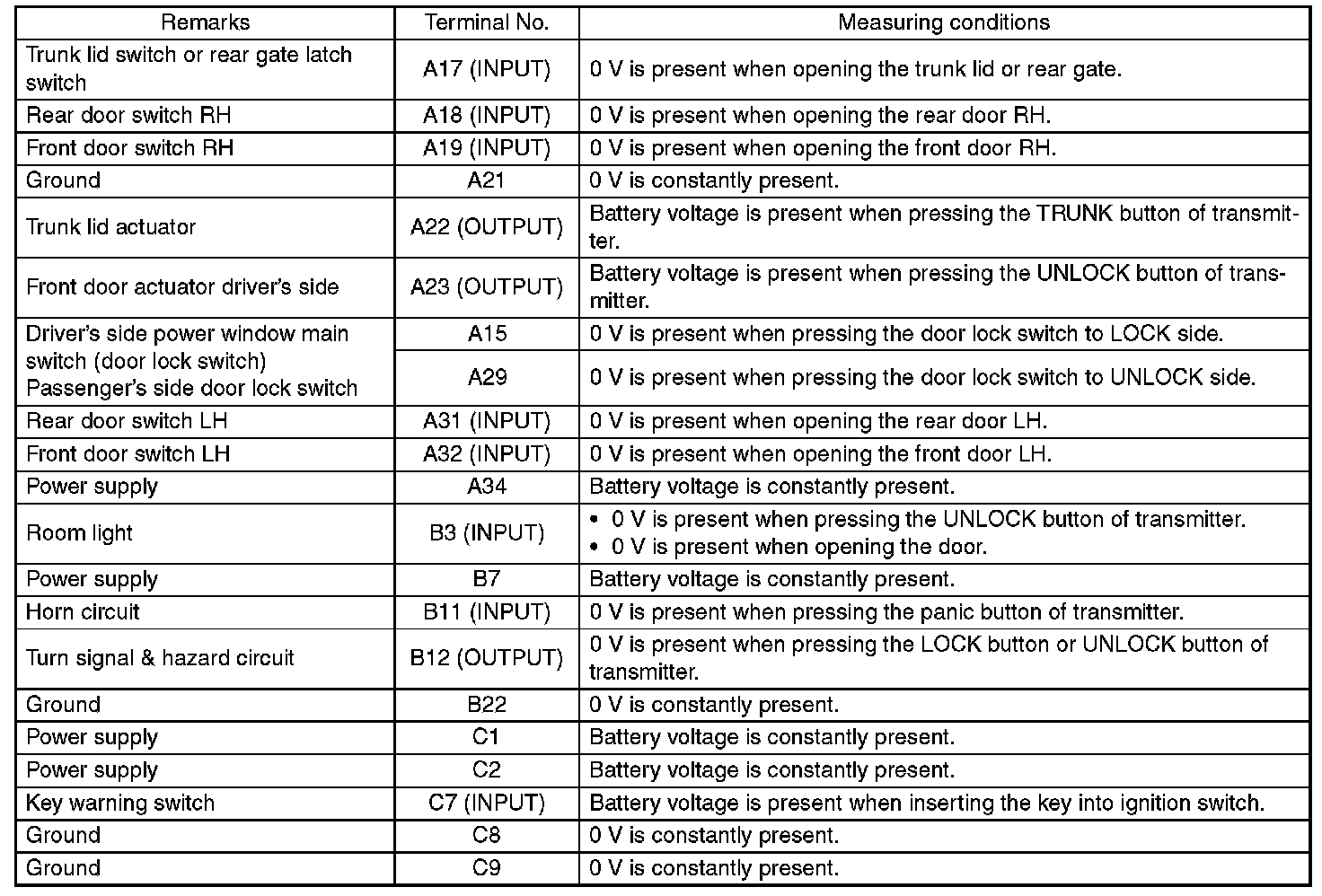 Pinout Values and Diagnostic Parameters