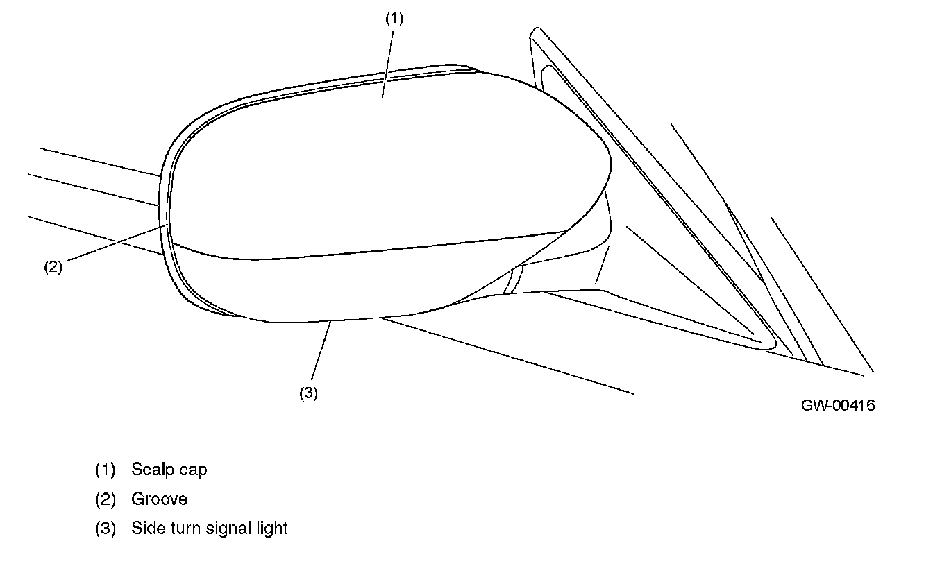 - The mirror body is structured as a scalp cap. The portion that may be damaged easier (scalp cap part and the side turn signal lamp part) can be replaced, contributing to reduce repair cost.