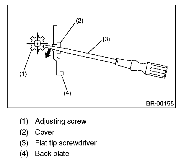 1 Turn the adjusting screw using a flat tip screwdriver until the brake shoe gets away enough from the disc rotor.