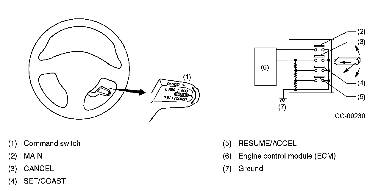 - When the vehicle is driven with the cruise control activated, the command switch controls its operation. It inputs MAIN signal, SET/COAST signal, RESUME/ACCEL signal or CANCEL signal to the engine control module (ECM).