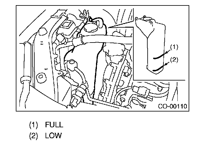 3 Fill engine coolant into the reservoir tank up to "FULL" level.