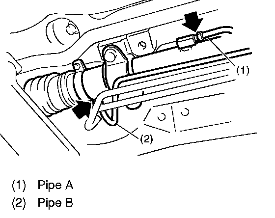3. Remove one pipe joint at the center of gearbox, and connect the vinyl hose to the pipe and the joint. Discharge the fluid by turning steering wheel fully clockwise and counterclockwise. Discharge the fluid similarly from other pipes.
