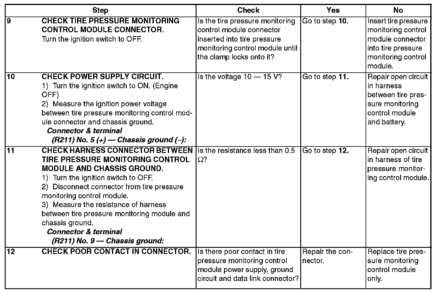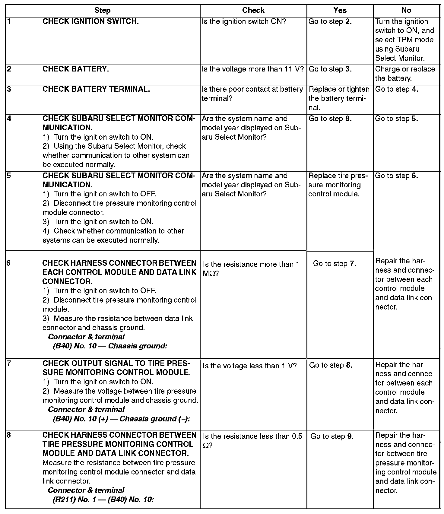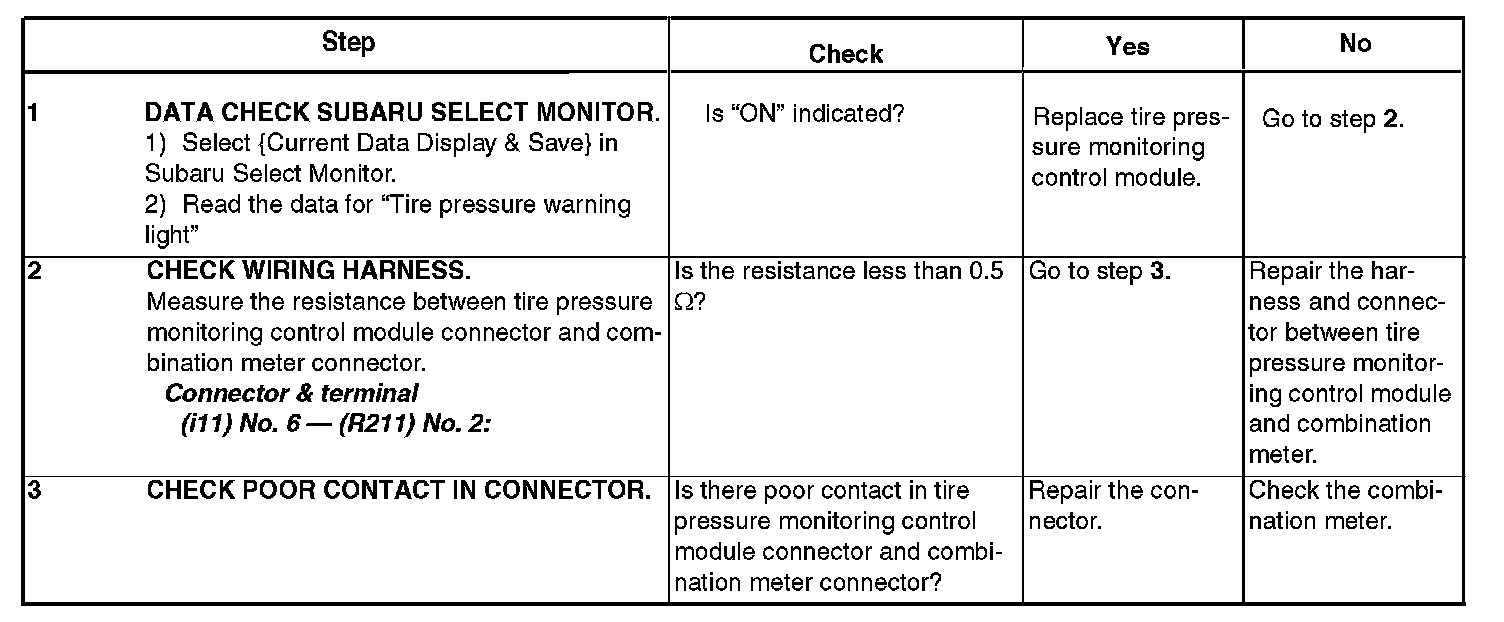 10. If tire pressure monitoring control module and Subaru Select Monitor cannot communicate, check the communication circuit.