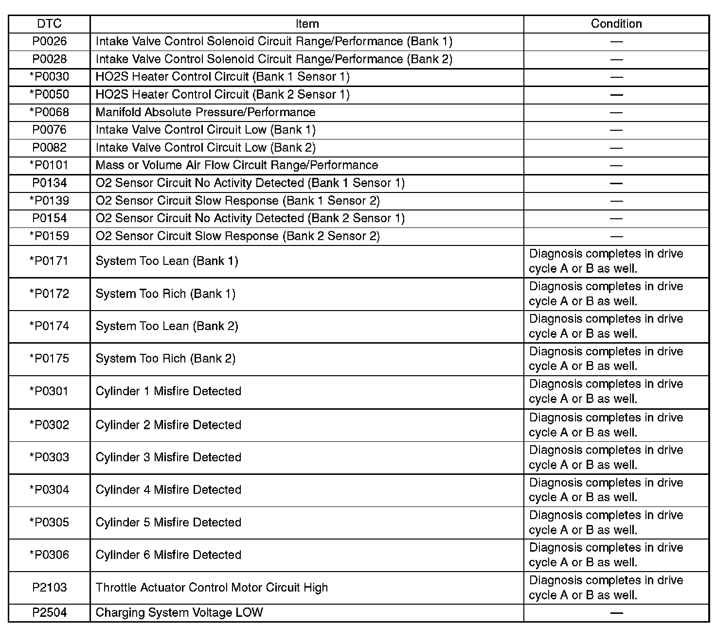 - Carry out the diagnosis which is marked * on DTC twice, then, after finishing first diagnosis, stop the engine and do second time at the same condition.
