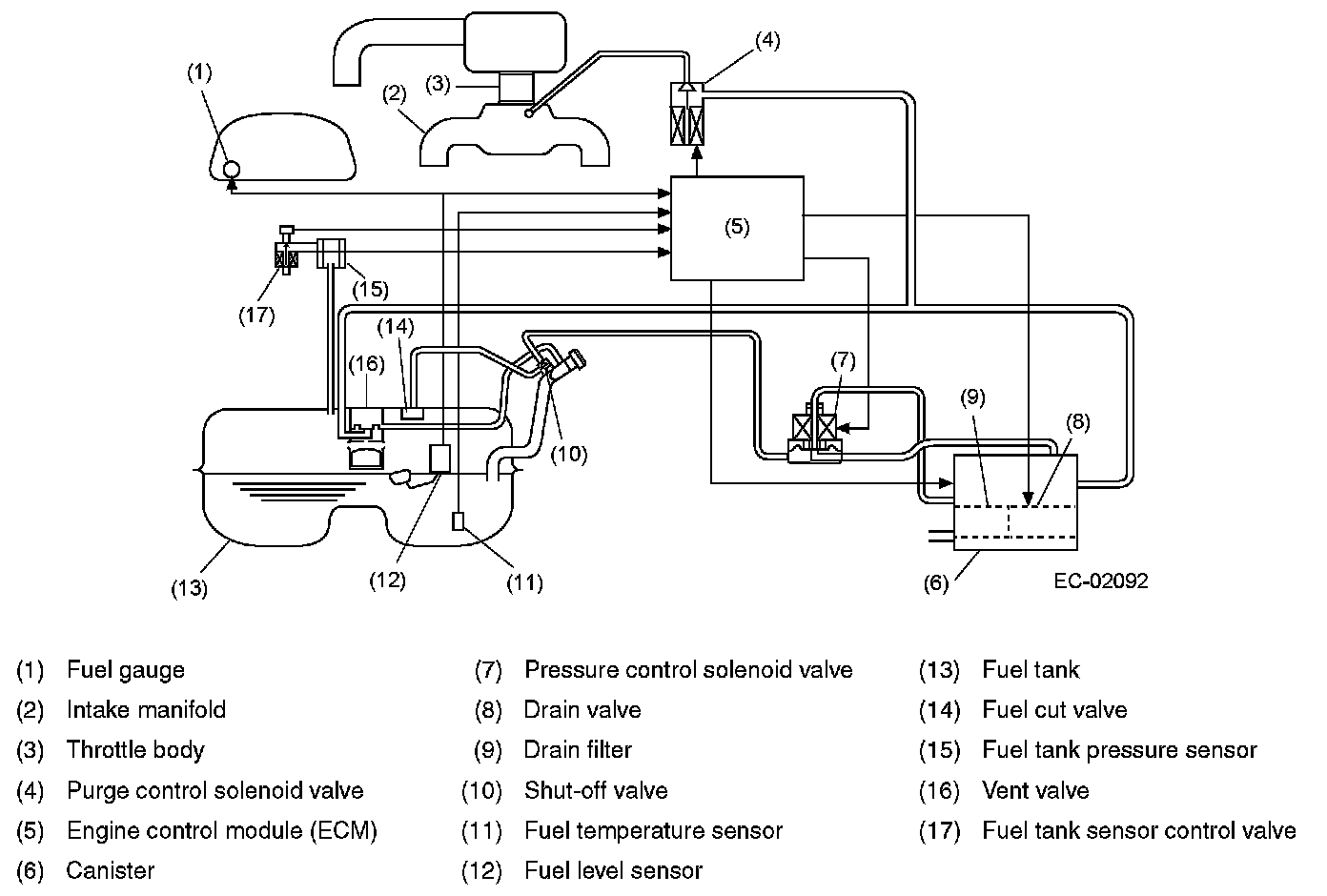This system includes a canister, purge control solenoid valve, fuel cut valve, and the lines connecting them.