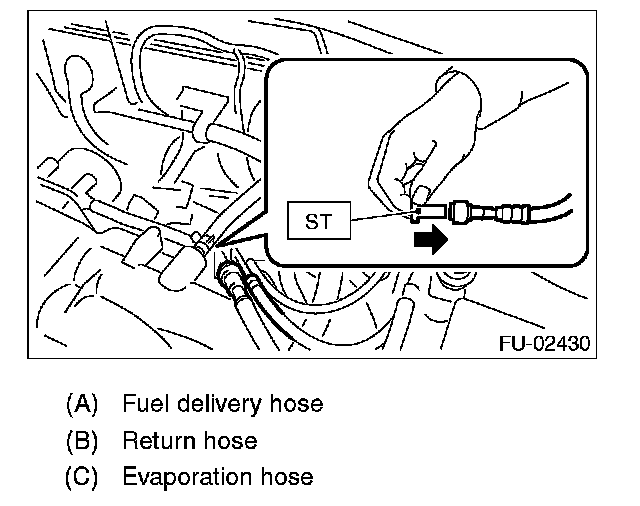 1. Disconnect the quick connector of fuel delivery line and return line by pushing the ST in the direction of arrow.