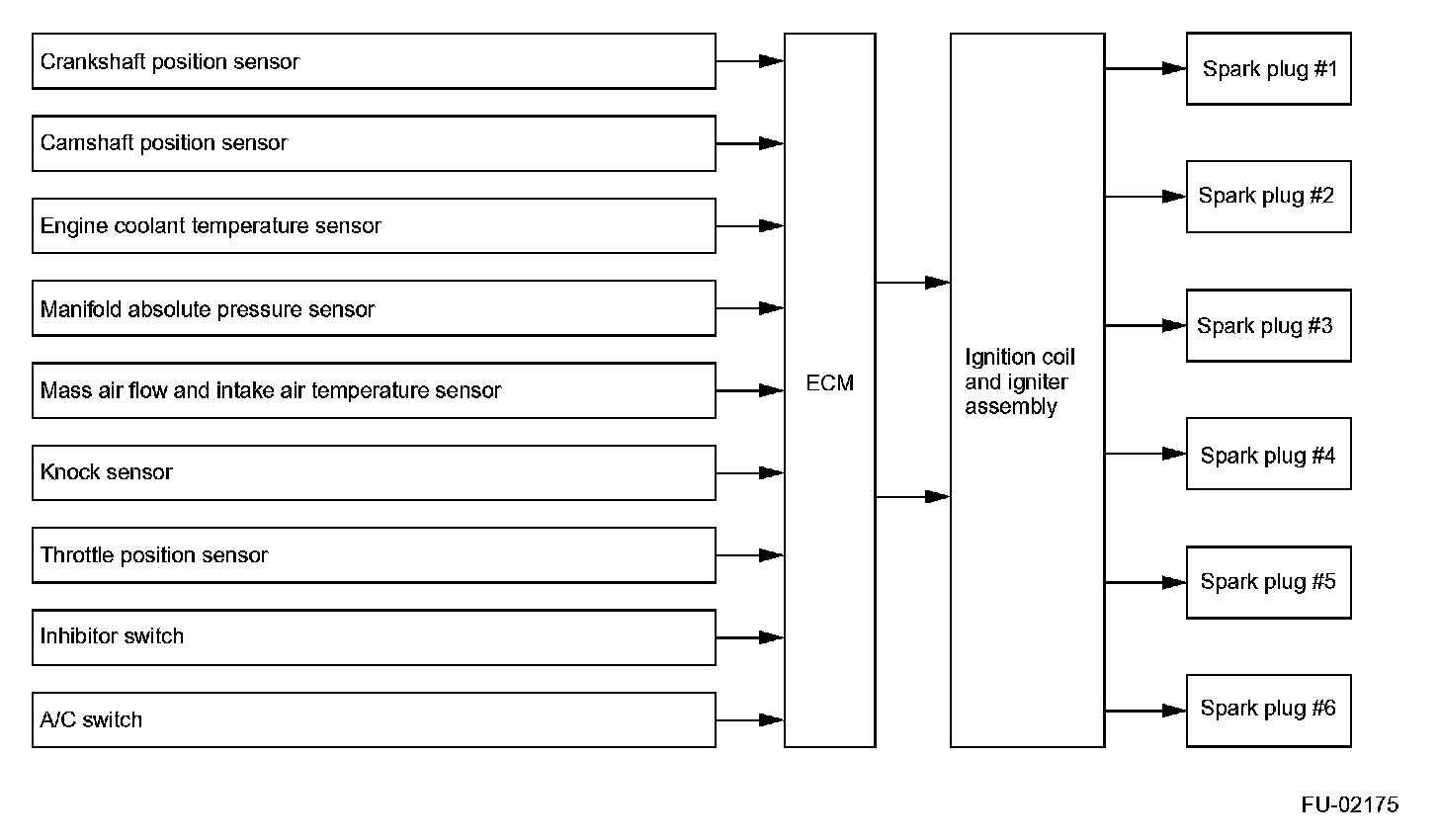 IGNITION CONTROL- The ECM determines operating condition of the engine based on signals from the mass air flow and intake air temperature sensor, manifold absolute pressure sensor, engine coolant temperature sensor, crankshaft position sensor and other sources. The ECM then selects the ignition timing most appropriate for the condition thus determined from those stored in its memory and outputs at that timing a primary current OFF signal to the igniter to initiate ignition.