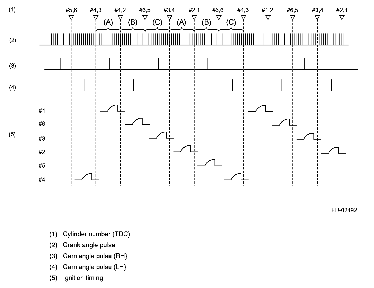 The ECM interprets the pulses of range (A) shown as the No.1 and No.2 cylinder pistons being at TDC, the pulses of range (B) as the No.5 and No.6 cylinder pistons being at TDC, and the pulses of range (C) as the No.3 and No.4 cylinder pistons being at TDC.