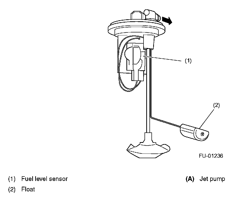 SUB-COMPARTMENT FUEL LEVEL SENSORThis sensor detects the level of the fuel in the sub side (the side without a fuel pump) of the fuel tank. Also, when the jet pump is operating, fuel in the sub side is drawn up and transferred to the fuel pump.