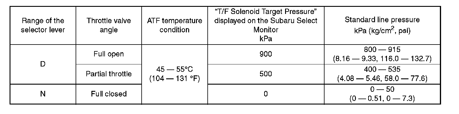 ^ Adjust the throttle valve angle in order to obtain the T/F solenoid target pressure displayed on the Subaru Select Monitor.