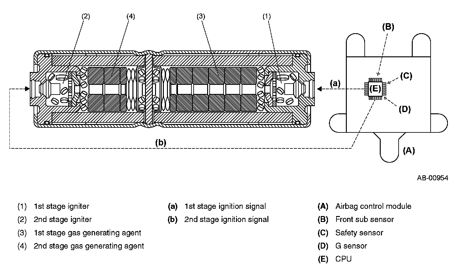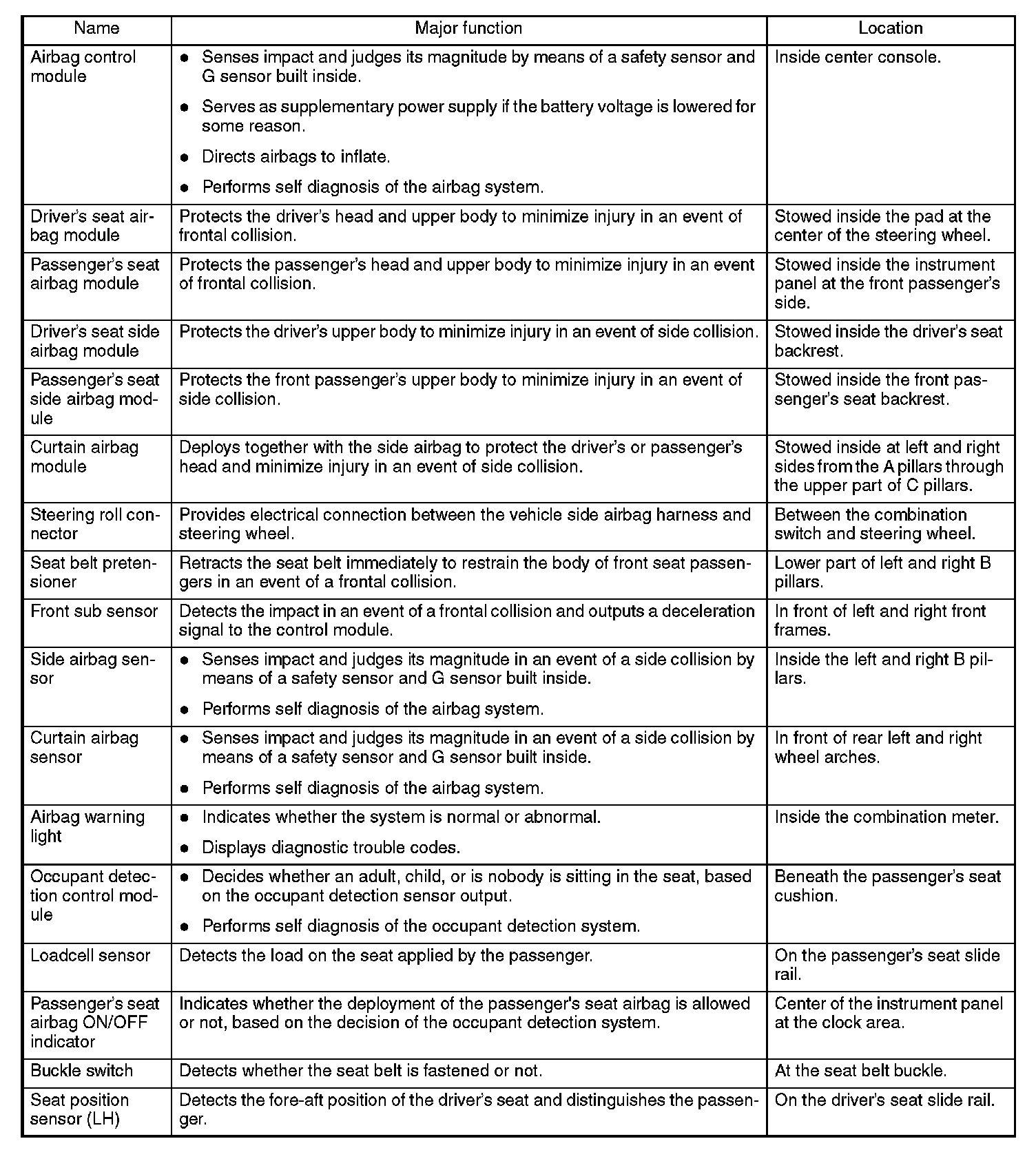 The control module receives electric signals from the safety sensor and electric sensor inside the module and also from the front sub sensor to detect the deceleration of the vehicle and judge whether the airbag and pretensioners should be ignited or not. It also has a self diagnosis function which lights up the airbag warning light in the combination meter if a fault occurs in the system. Diagnostic trouble codes generated by the self diagnosis function are stored in the memory in the module.