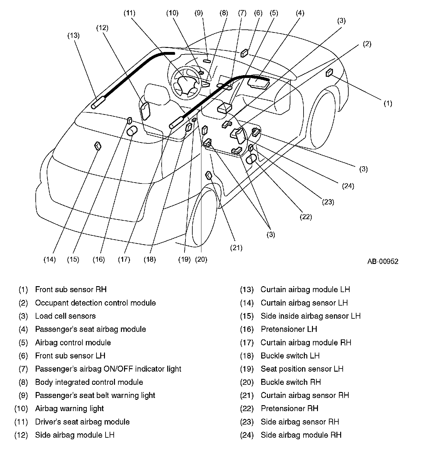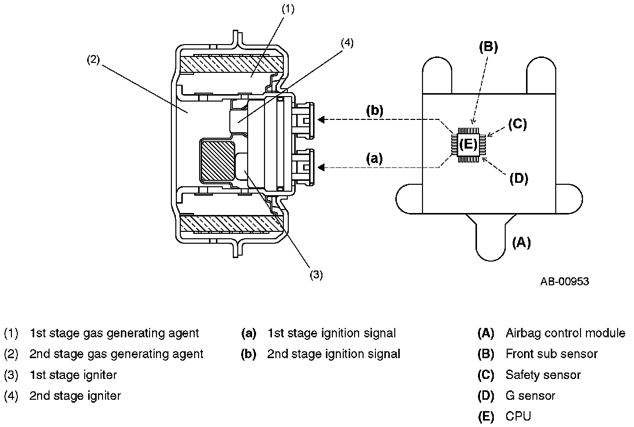 The airbag control module controls the operation of the seat belt pretensioner. If the front sub sensor and the sensors inside the airbag control module detect an impact exceeding a specified level, the driver's seat and front passenger's seat airbags are deployed almost simultaneously. Upon receiving signals from the airbag control module the gas generator inside the pretensioners are ignited and the gas pressure retracts the seat belts in a very short time to improve the passenger restraint effect.
