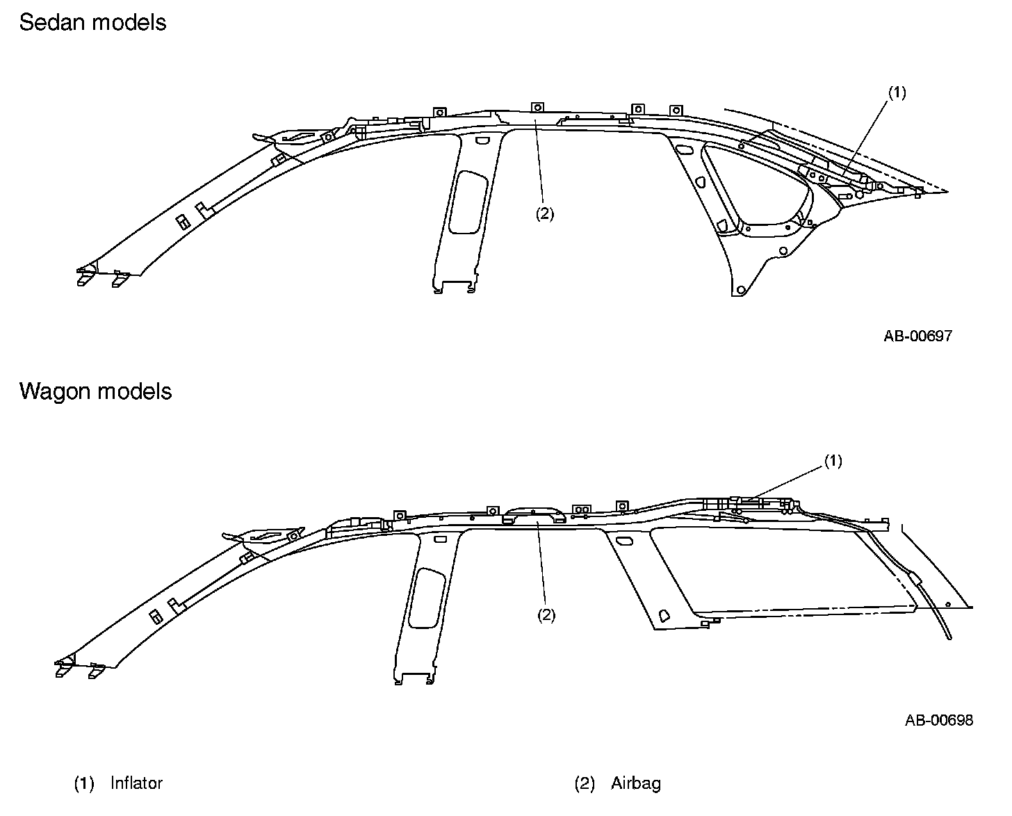 The SRS curtain airbag module cannot be disassembled. The curtain airbag modules are fixed to the vehicle body with a bracket and clips, and consists of an inflator and an airbag.