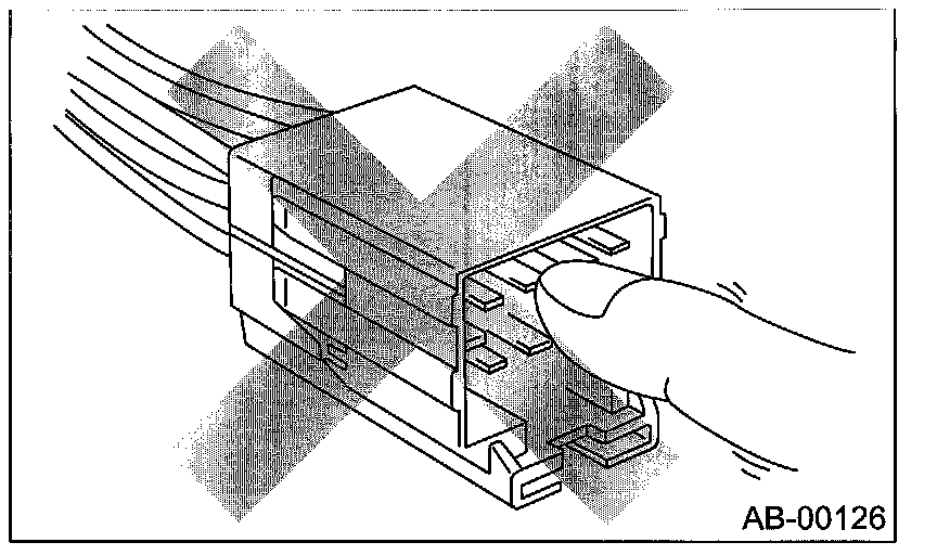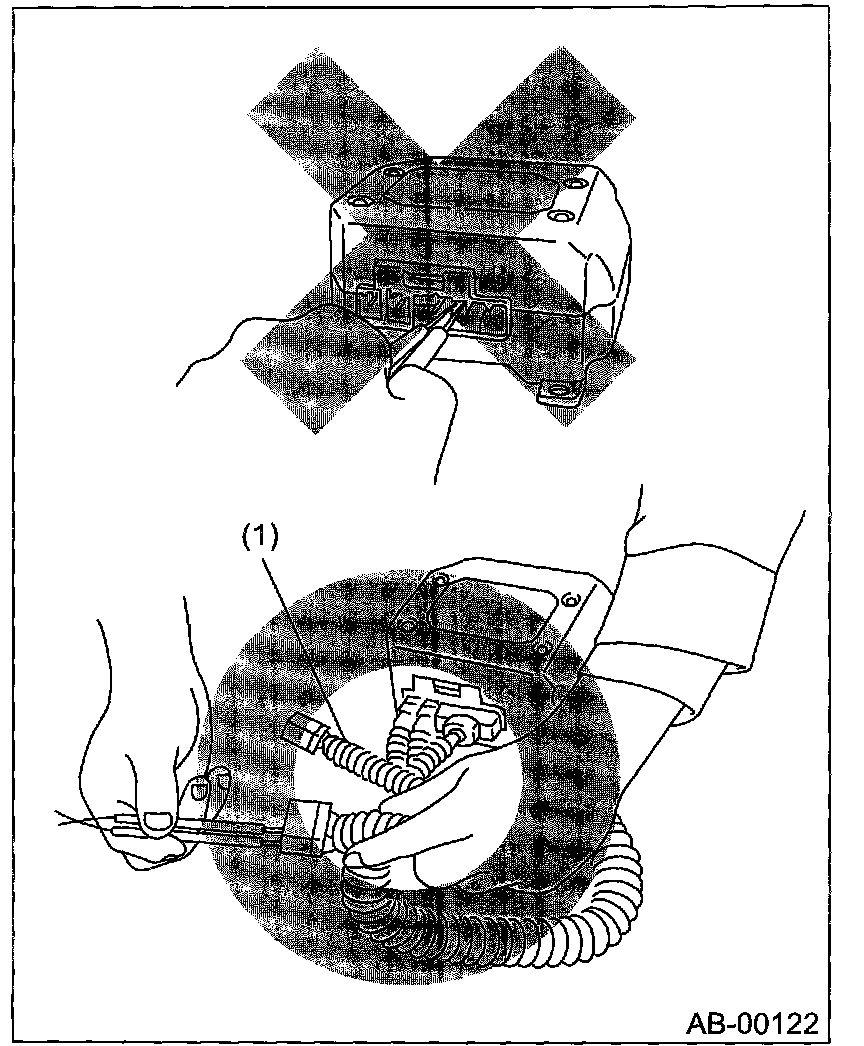 - When checking, use a test harness (1). Since damage to the connector terminal may cause the airbag to activate erroneously, do not directly apply the tester probe to any connector terminal of the airbag.