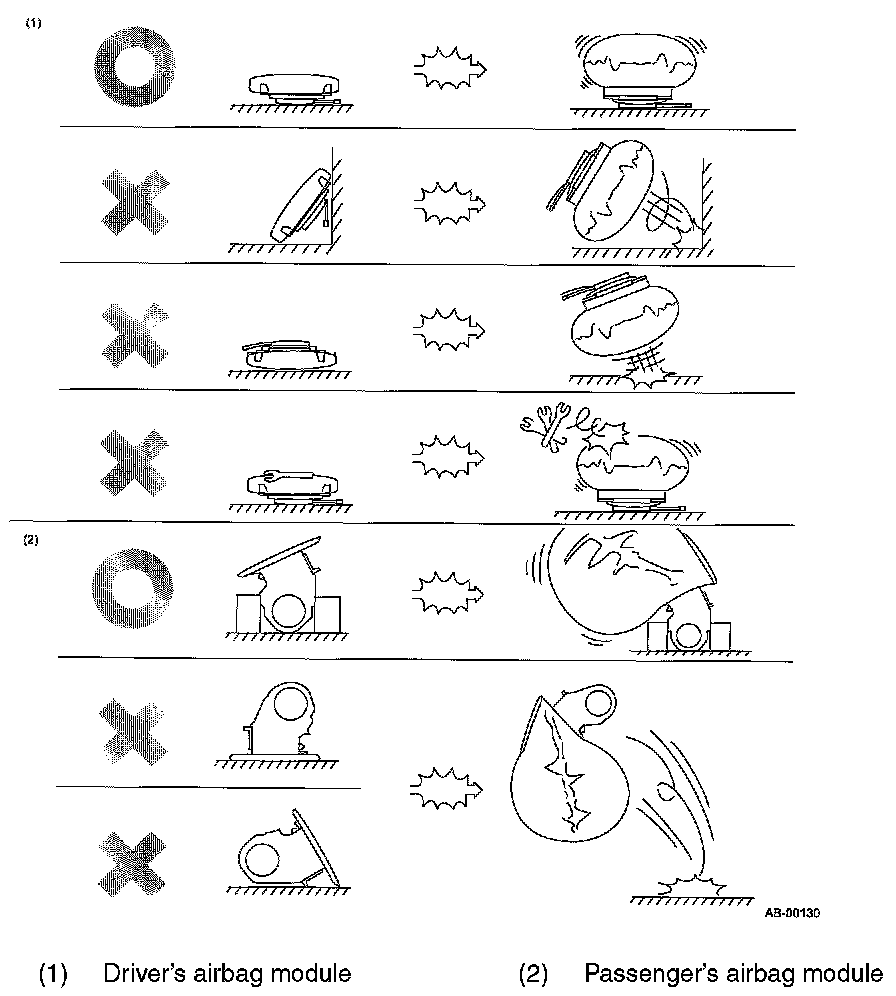 - When storing a removed airbag module, do not place any objects on it or pile airbag modules on top of each other. If the airbag inflates for some reason when it is placed with its pad side facing downward or under any object, a serious accident may result.