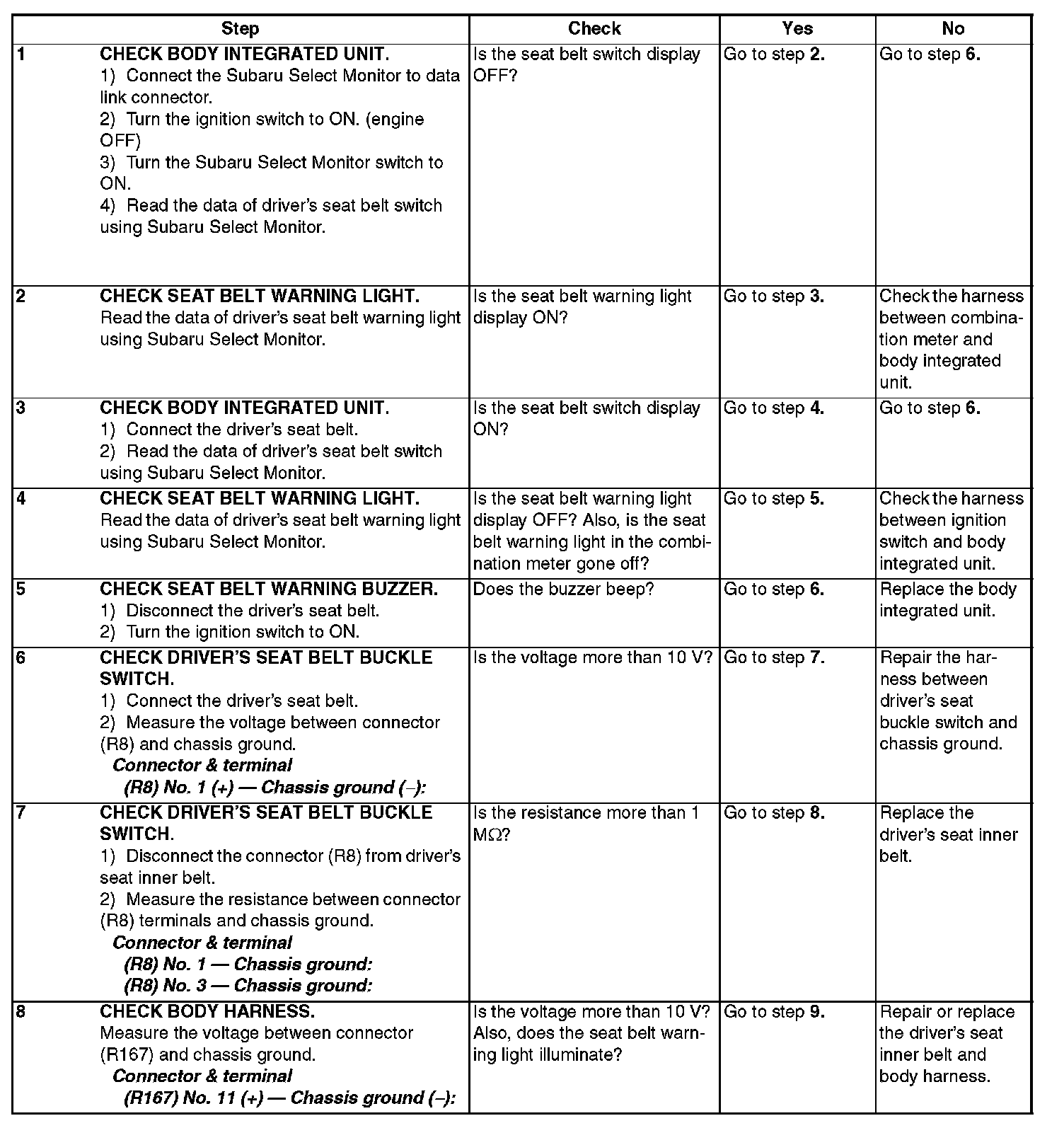 Driver's side seat belt warning light does not come on or go off.
