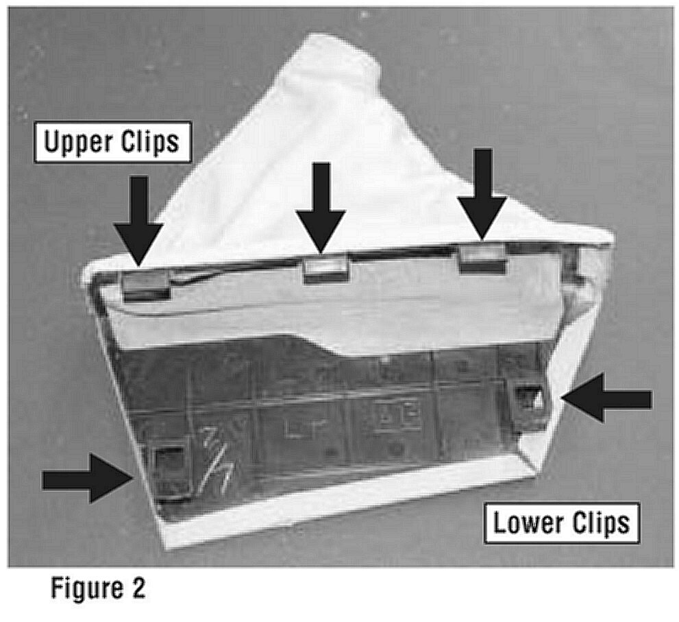 Insert finger into gap between carpet and parking brake cover; release the two lower clips by pushing them up (see Figure 3) and at the same time carefully pull up on the cover. Upper clips will release at the same time. If upper clips do not released at the same time, insert finger from upper side of the cover and release the clips.