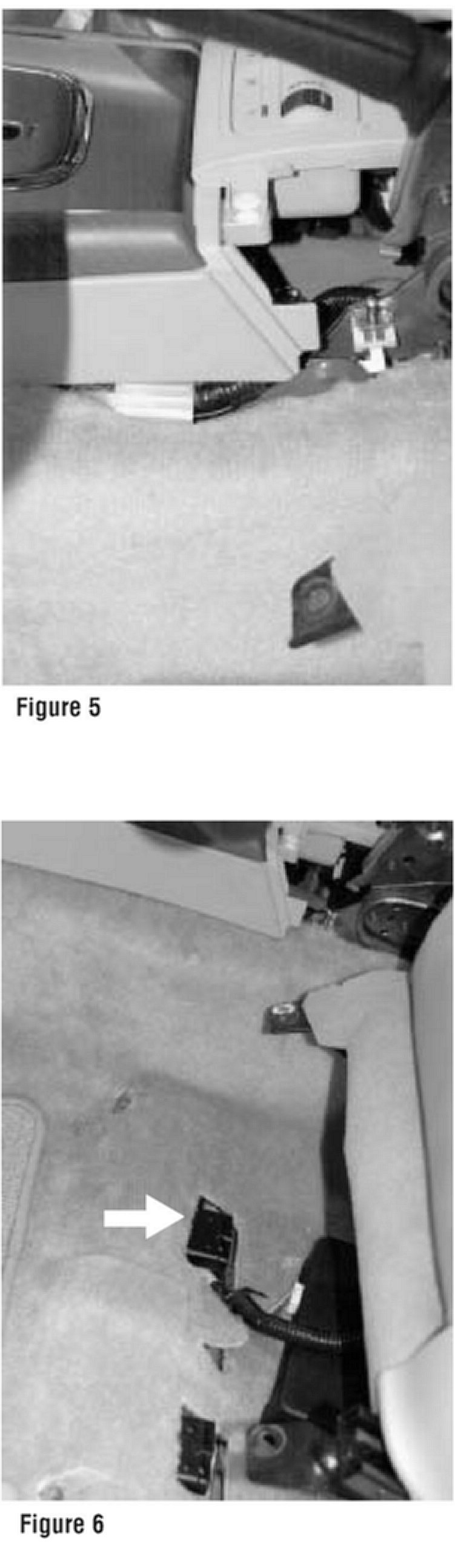 10) Re-route blue wiring harness under black wiring harness (and away from parking brake assembly and switch), then behind carpet starting at center console location (see Figure 5) and exit through carpet opening at rear passenger heater vent (see Figure 6). Make sure to tuck wiring harness and carpet under center console when finished.