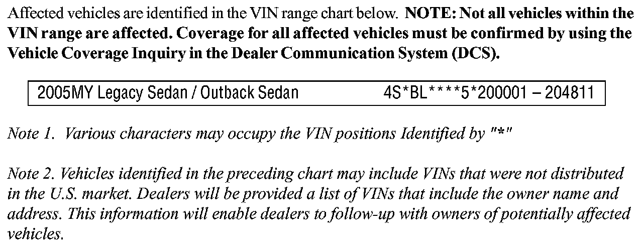 Any Authorized Subaru Dealer failing to perform the applicable service procedures defined in this bulletin to correct all affected vehicles in their inventory (new, used, demo) prior to the vehicle being placed in service may be subject to civil penalties of up to $5,000 per violation (i.e., for each vehicle), as provided in 49 USC �30165(a) of the Safety Act, and will also be in breach of the Subaru Dealer Agreement.