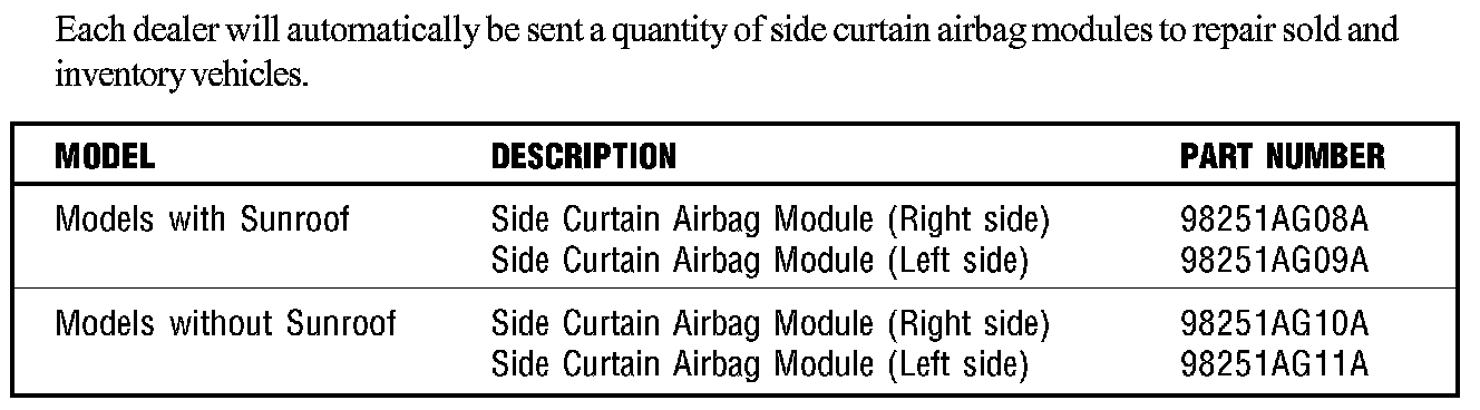 This recall will involve replacement of both Side Curtain Air Bag models.