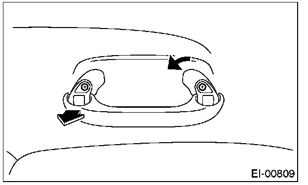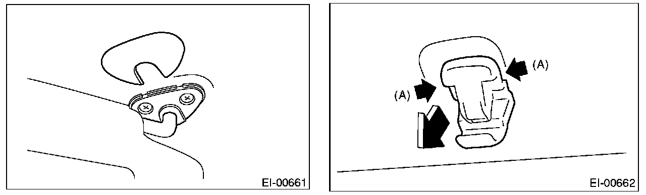 5. Remove the Sun Visors by carefully removing the covers and the mounting screws. If equipped with vanity mirror lights, disconnect the wiring connector. Remove the Sun Visor Hooks by pressing the (A) on both sides, using a flat tip screwdriver and pulling the hook towards you.