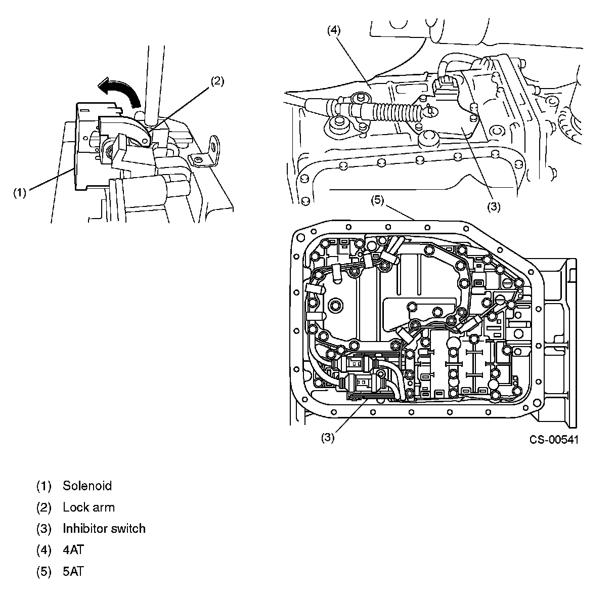 SHIFT LOCK SYSTEM OPERATIONThe shift lock system has a solenoid-operated plunger (1). With the select lever in the P position, the plunger remains extended, holding the lock arm (2) in its pushed out (locking) position. When the brake pedal is depressed with the ignition switch in either the ON or START position, the solenoid is energized and the plunger is retracted. This causes the lock arm to lift to the select lever release position. The select lever now can be moved to any other position. The P position of the select lever is detected by the inhibitor switch (3).