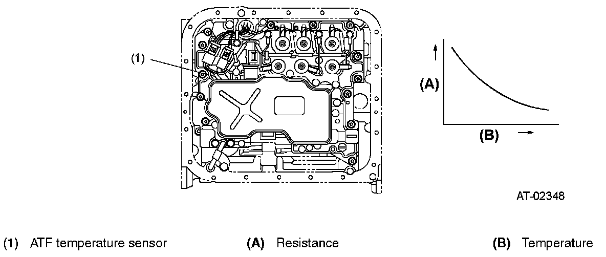 ATF TEMPERATURE SENSORThis sensor is integrated with the transmission harness and is mounted on the transmission control valve body. Its resistance varies in accordance with the ATF temperature. The characteristics of the sensor are as shown in the figure.
