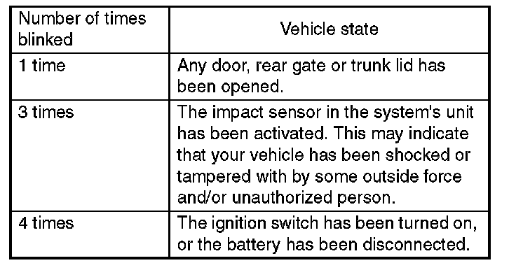 If an electronic chirp sounds four times and the turn signal lights blink four times when you disarm the system, this indicates that the alarm was triggered. The number of times the indicator light blanks indicates what sensor caused the alarm condition.