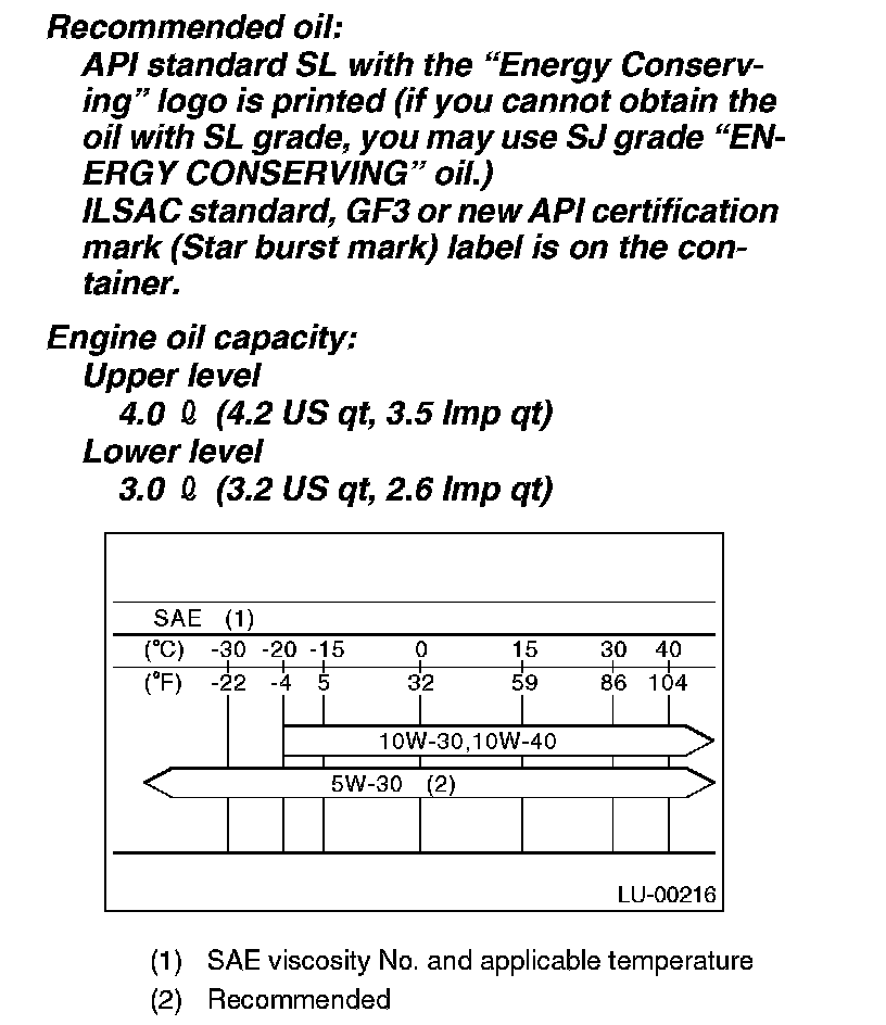 Recommended oil: API standard SL with the "Energy Conserving" logo is printed (if you cannot obtain the oil with SL grade, you may use SJ grade "ENERGY CONSERVING" oil.) ILSAC standard, GF3 or new API certification mark (Star burst mark) label is on the container.