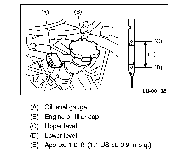 CAUTION: When replenishing oil, it does not matter if the oil to be added is a different brand from that in the engine; however, use oil having the API standard and SAE viscosity No. designated by SUBARU.