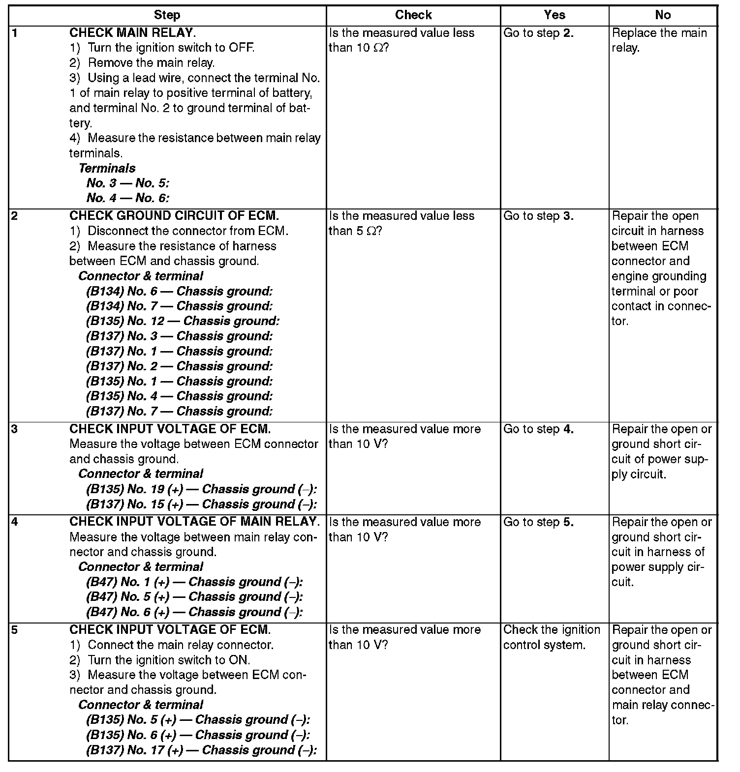CHECK POWER SUPPLY AND GROUND LINE OF ENGINE CONTROL MODULE (ECM)CAUTION: After repair or replacement of faulty parts, conduct Clear Memory Mode and Inspection Mode.