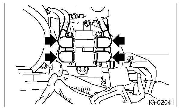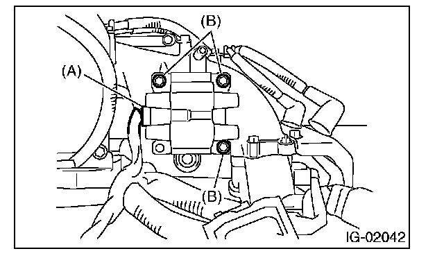 4. Remove the bolt (B) which secures the ignition coil and ignitor assembly to intake manifold.