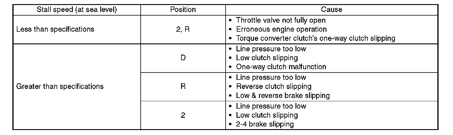 ^ If the stall speed is higher than the specified range, attempt to finish the stall test in as short a time as possible, in order to prevent the automatic transmission from sustaining damage.