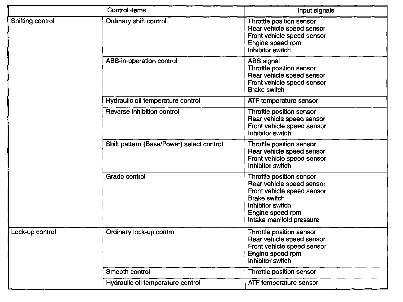 ^ The TCM has pre-programmed lock-up clutch engagement and disengagement conditions for each gear and shift pattern. In addition, it specifies engagement of the clutch whenever the 4th gear is selected in the D range. The engagement and disengagement conditions are defined in terms of the throttle valve position and vehicle speed.