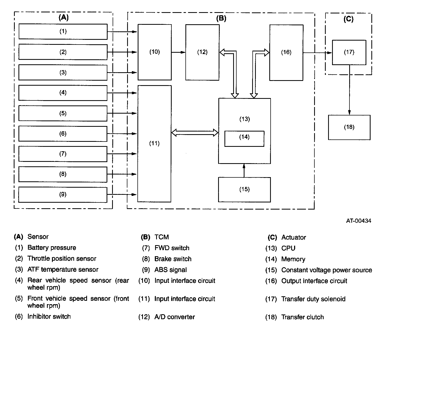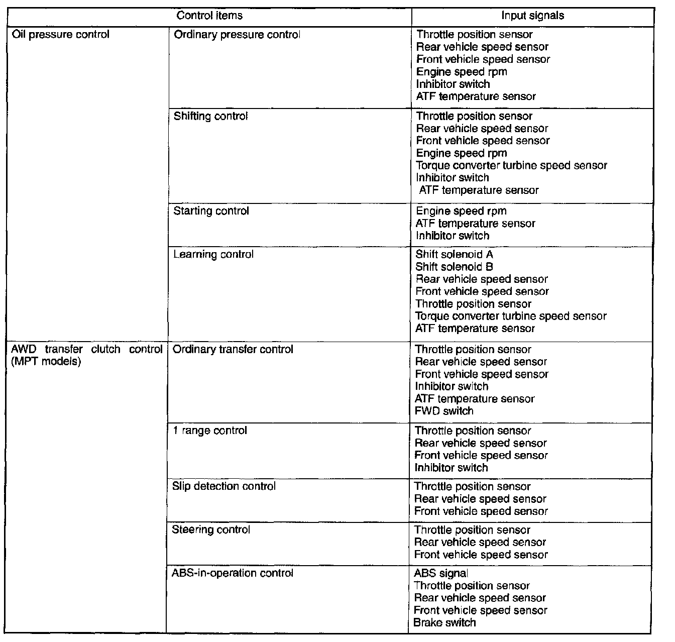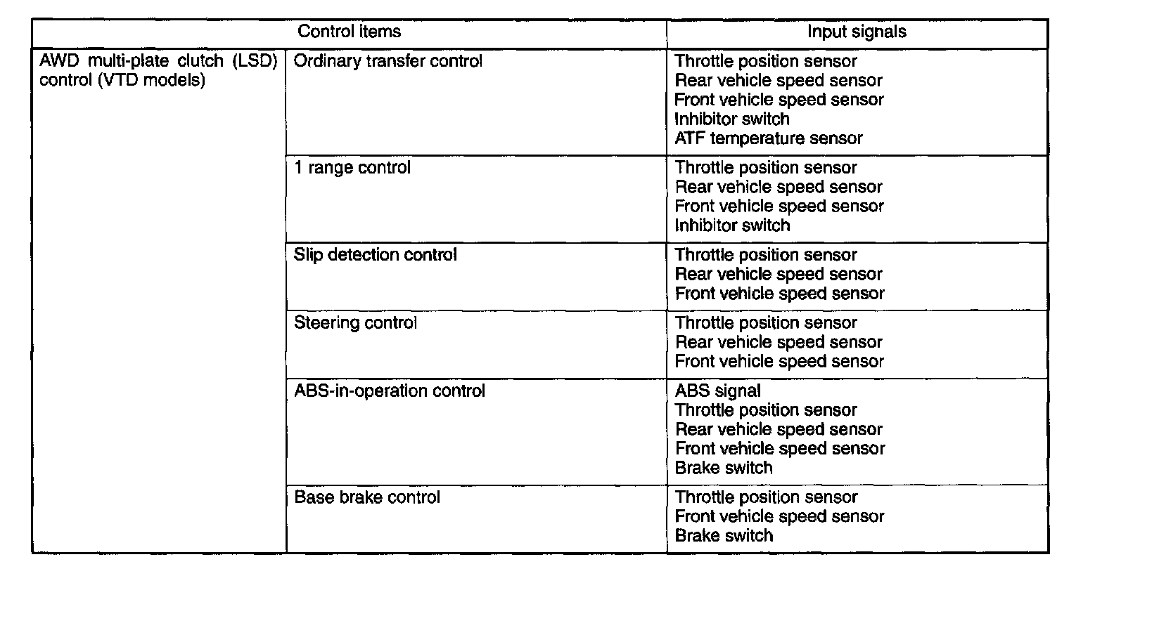 The TCM is constantly monitoring the driving conditions of the vehicle using the eleven input signals. Based on the conditions it has determined, the TCM adjusts the duty ratio of current to the transfer duty solenoid thus changing the engagement of the multi-plate clutch. The input signals are used also for automatic transmission control.