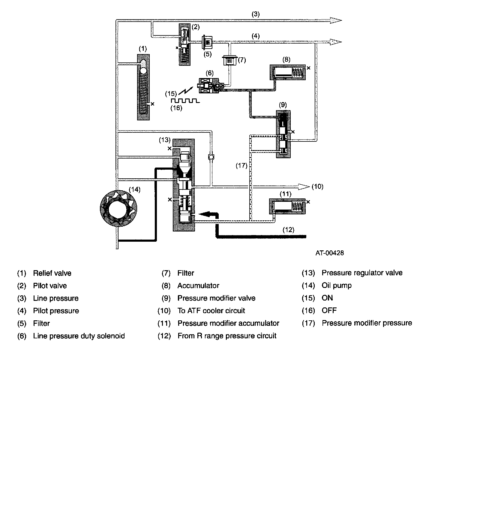 ^ The oil pump delivery pressure (line pressure) is regulated to a constant pressure by the pilot valve. This pressure is used as the pilot pressure for controlling spool valves.