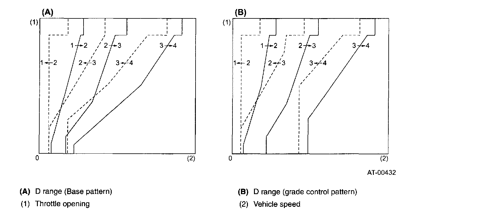 When the vehicle is descending a steep slope at a speed of approximately 80 km/h (50 MPH), a 4th to 3rd downshift occurs automatically when the brake pedal is depressed. This gearshift control is cancelled when the accelerator pedal is depressed.
