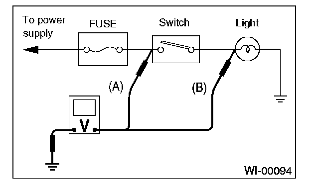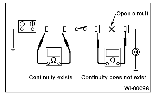 2. Ohmmeter method: Disconnect all connectors affected, and check the continuity in wiring between adjacent connectors. When the ohmmeter indicates "infinite", the wiring is open.