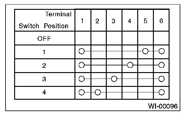 3. Symbol "O--O" indicates that continuity exists between two points or terminals. For example, when a switch position is "3", continuity exists among terminals 1, 3 and 6, as shown in table.