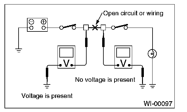 1. Voltmeter Method: An open circuit is determined by measuring the voltage between respective connectors and ground using a voltmeter, starting with the connector closest to power supply. The power supply must be turned ON so that current flows in the circuit. If voltage is not present between a particular connector and ground, the circuit between that connector and previous connector is open.