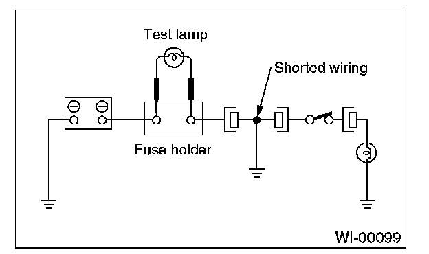 1. Test lamp method: Connect a test lamp (rated at approx. 3 watts) in place of the blown fuse and allow current to flow through the circuit. Disconnect one connector at a time from the circuit, starting with the one located farthest from power supply. If the test lamp goes out when a connector is disconnected, the wiring between that connection and next connector (farther from the power supply) is shorted.