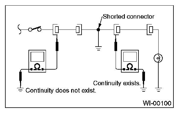 2. Ohmmeter method: Disconnect all affected connectors, and check the continuity between each connector and ground. When the ohmmeter indicates continuity between a particular connector and ground, that the connector is shorted.