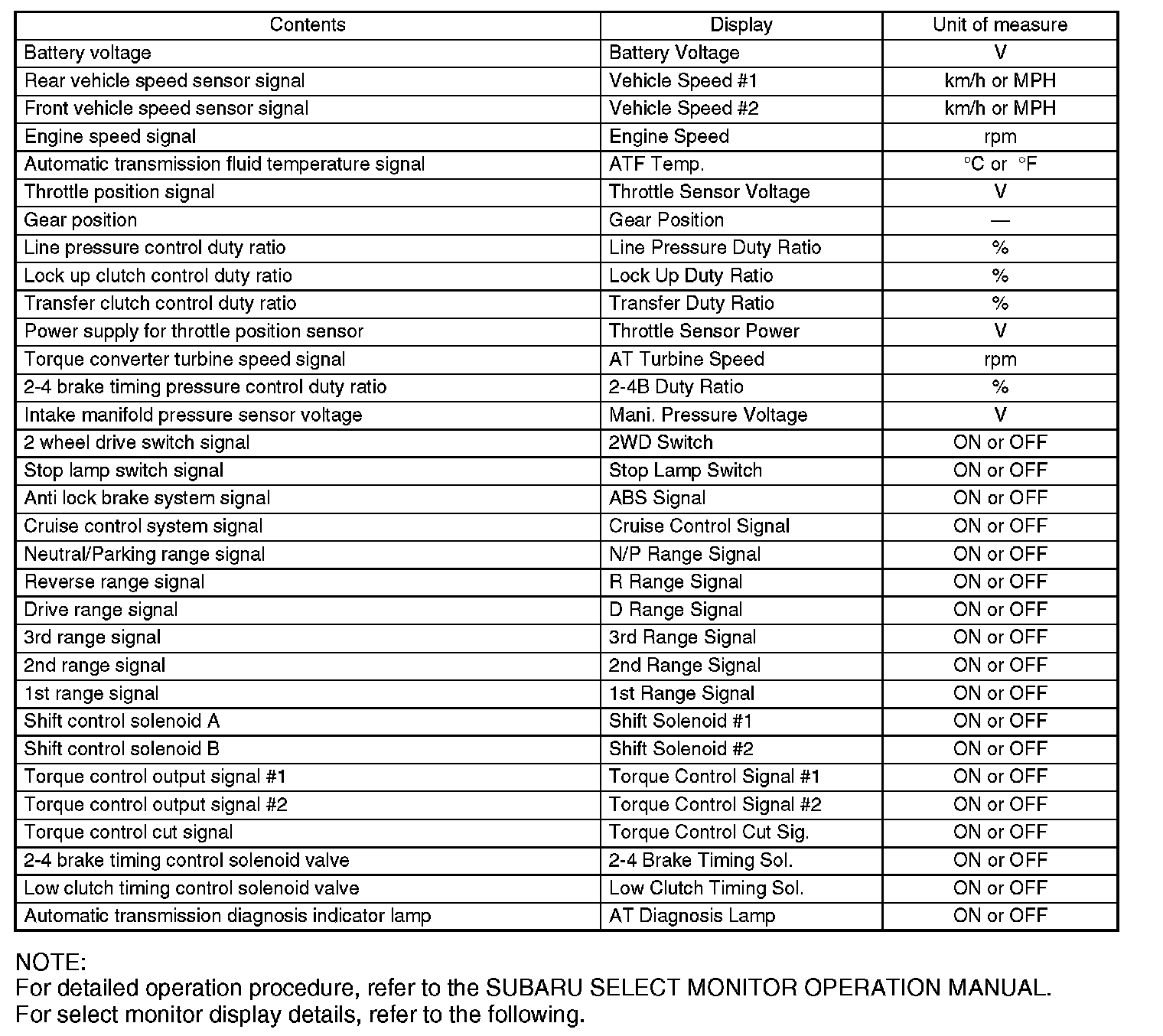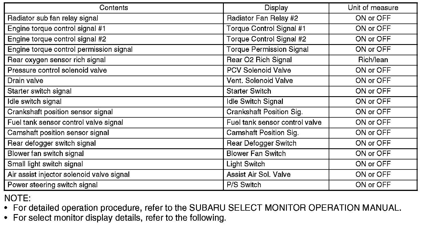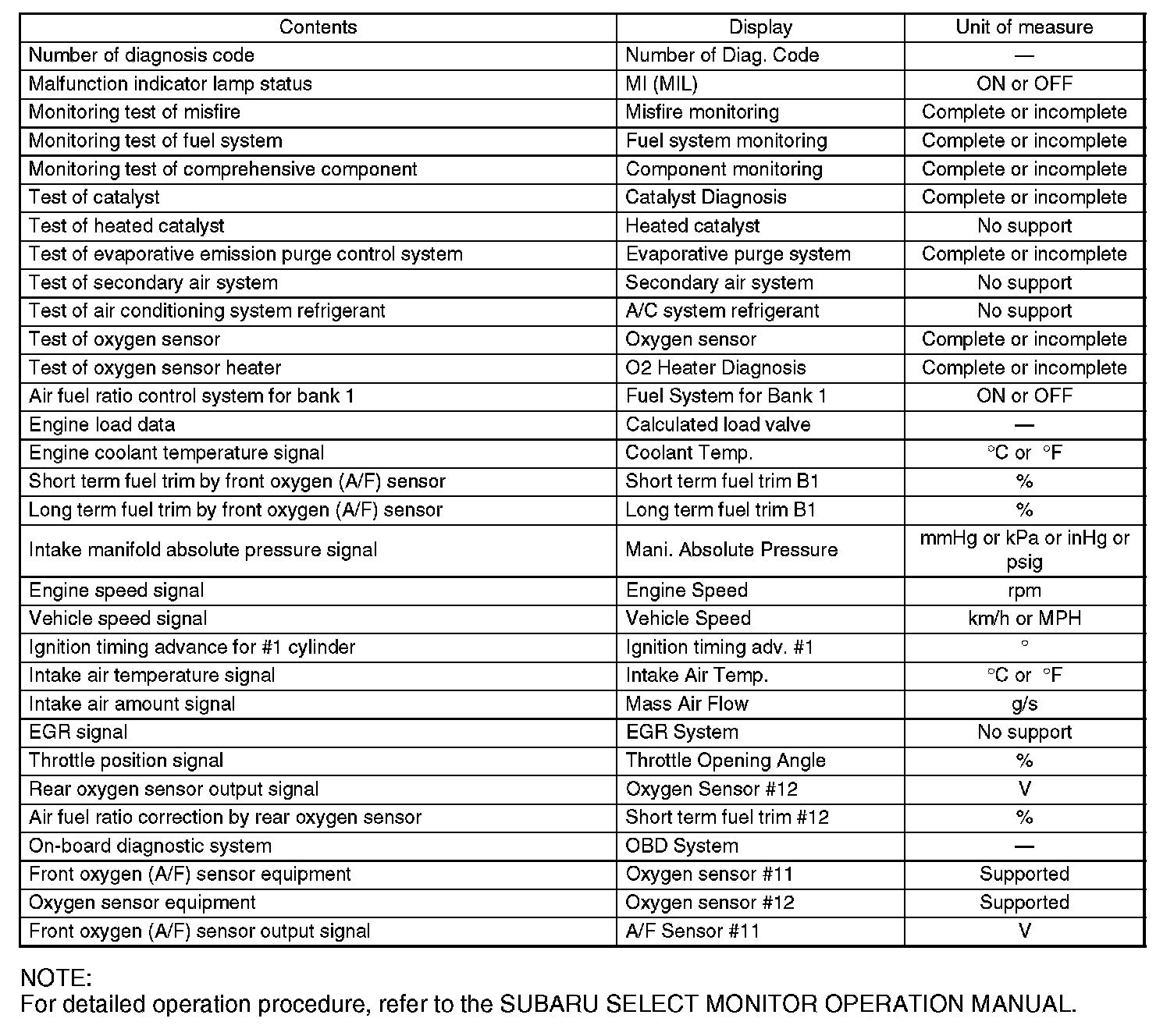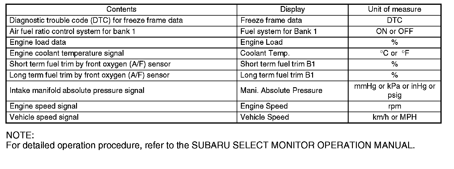 6. Using Subaru Select Monitor, call up diagnostic trouble code(s) and various data, then record them.