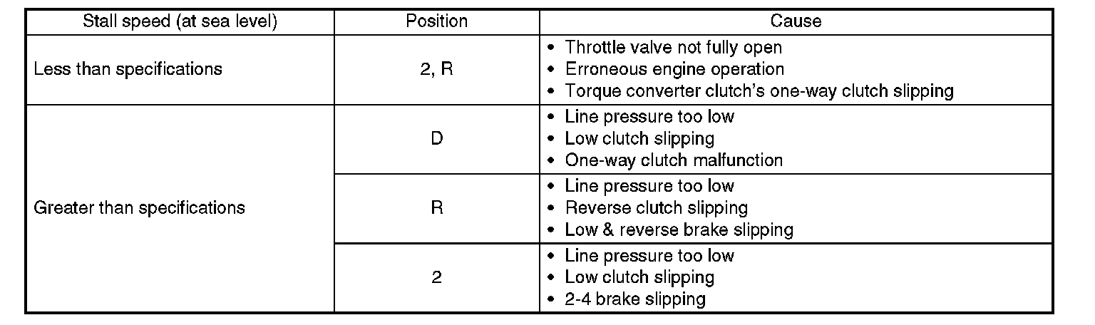 ^ If the stall speed is higher than the specified range, attempt to finish the stall test in as short a time as possible, in order to prevent the automatic transmission from sustaining damage.