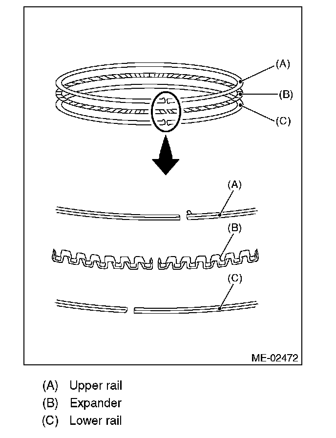 ^ Oil ring consists of the upper rail, expander and lower rail. Be careful about the direction of rail when installing the oil ring to piston.