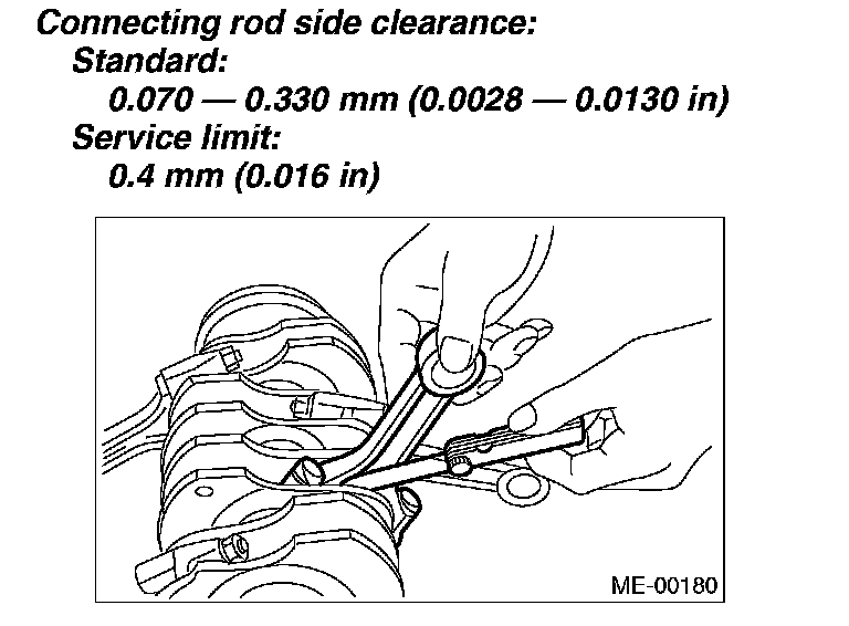 3. Install the connecting rod fitted with bearing to crankshaft and measure the side clearance (thrust clearance). Replace the connecting rod if the side clearance exceeds the specified limit.