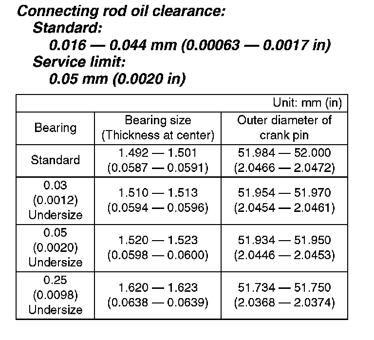 5. Measure the oil clearance on each connecting rod bearing using plastigauge. If any oil clearance is not within the standard, replace the defective bearing with a new one of standard size or undersize as necessary. (See the table below.)