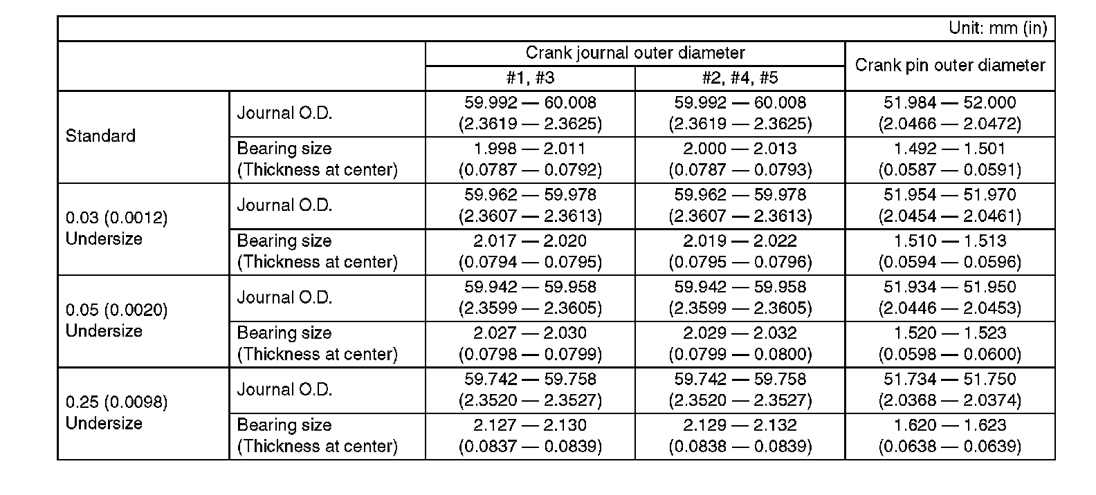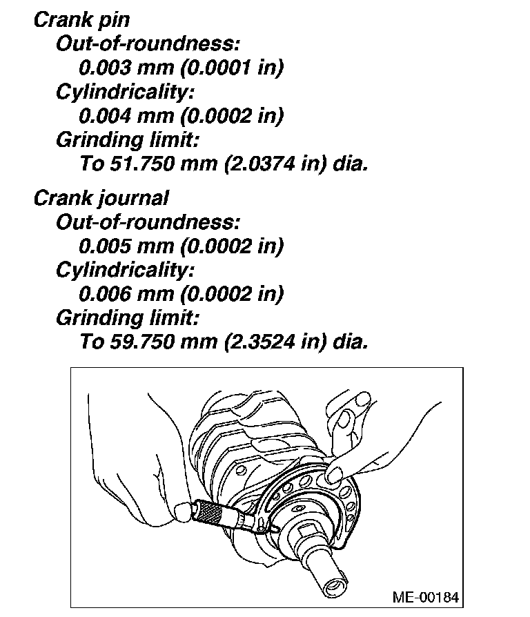 3. Inspect the crank journal and crank pin for wear. If they are not within the specification, replace the bearing with a suitable (undersize) one, and replace or readjust crankshaft as necessary. When grinding the crank journal or crank pin, finish them to the specified dimensions according to the undersize bearing to be used.