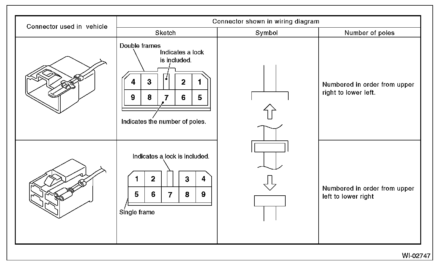 - The number of poles or pins, presence of a lock are indicated in the sketch of each connector. In the sketch, the highest pole number refers to the number of poles which the connector has. For example, the sketch of the connector shown in figure indicates the connector has 9 poles.