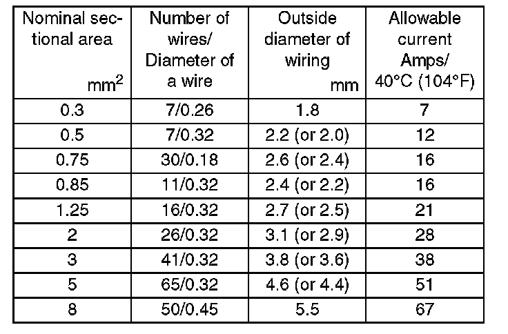 - The table lists the nominal sectional areas and allowable currents of the wires.